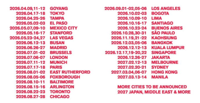 한국 공연 이후에도 전 세계를 도는 대장정이 이어집니다. 해외 원정을 계획 중이시라면 참고하세요!