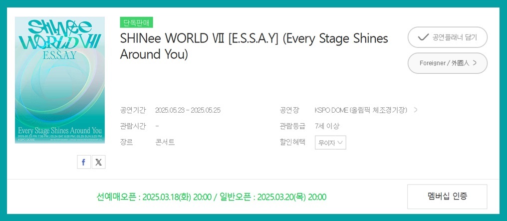 샤이니의 일곱 번째 단독 콘서트 'SHINee WORLD Ⅶ [E.S.S.A.Y] (Every Stage Shines Around You)'의 티켓 예매는