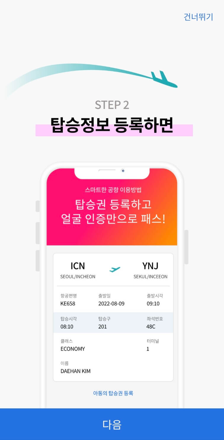 항공사 온라인 체크인을 마친 후, 앱에서 탑승권 정보를 등록합니다. 이를 통해 얼굴 인식만으로 수하물 위탁 및 탑승구 통과가 가능합니다.