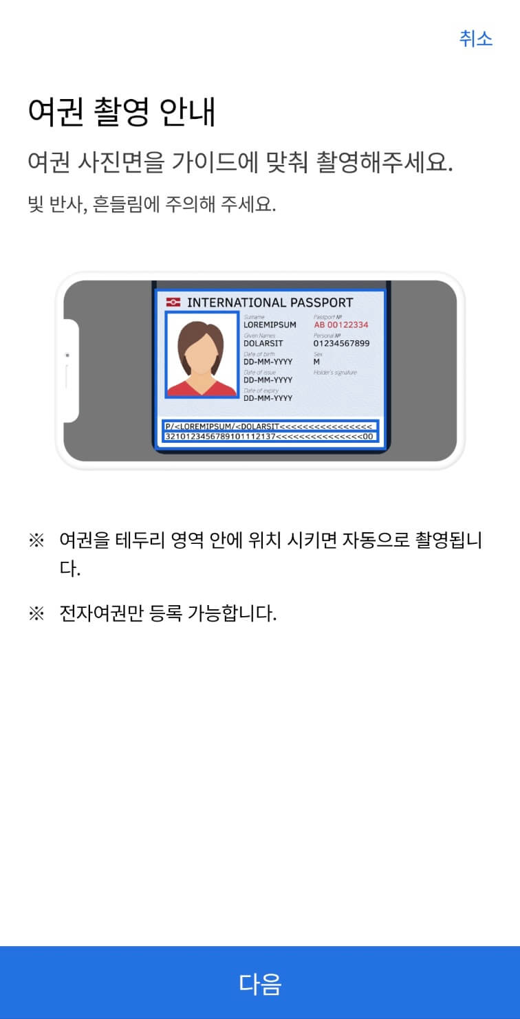 스마트패스 서비스는 전자여권 소지자만 이용 가능합니다. 전자여권은 여권 하단에 칩 모양의 전자여권 로고가 표시되어 있습니다. 여권의 사진이 있는 면을 펼치고, 앱의 안내에 따라 카메라로 여권을 스캔합니다. 스캔이 완료되면 NFC 기능을 통해 여권의 전자칩 정보를 읽어옵니다.