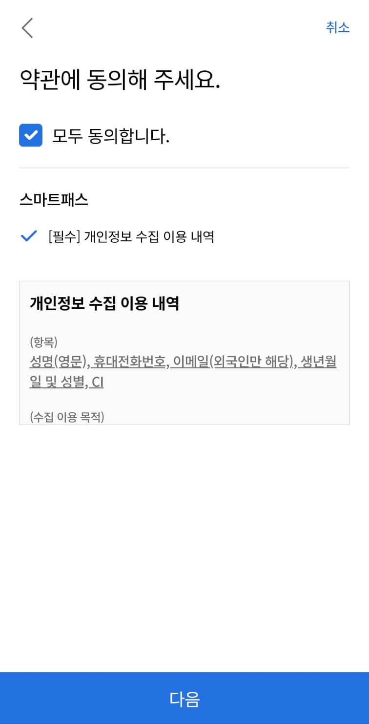 설치한 앱을 실행하면 스마트패스 서비스에 대한 설명 화면이 나타납니다. 안내에 따라 서비스 이용 약관 및 개인정보 처리 방침에 동의합니다.