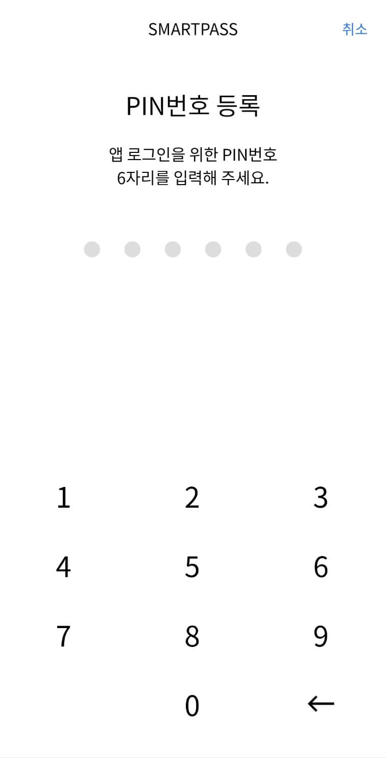 스마트패스 ID를 생성하기 위해 PIN 번호를 설정합니다. 이때, 스마트폰의 생체인식 기능(지문 또는 얼굴 인식)을 활용하여 인증을 설정할 수 있습니다.
