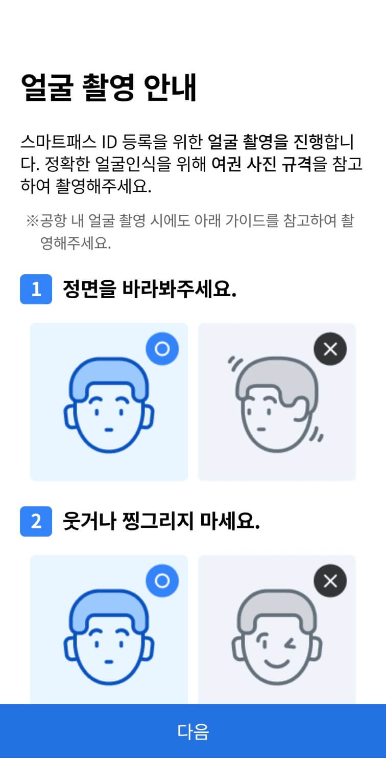여권 정보 등록 후, 얼굴 인식을 위한 안면 정보를 등록합니다. 앱의 안내에 따라 정면을 바라보고, 눈을 감은 상태 등 다양한 각도로 얼굴을 촬영하여 등록합니다.