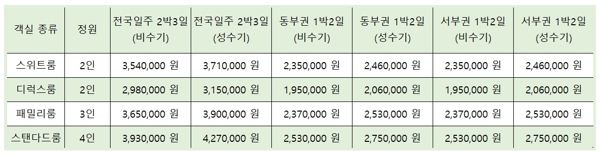 - 패밀리룸: 더블사이즈 2층 침대 1개, 기준 3인(예외적으로 성인3+영유아, 성인 2+초등생 2 조합만 4인 가능)